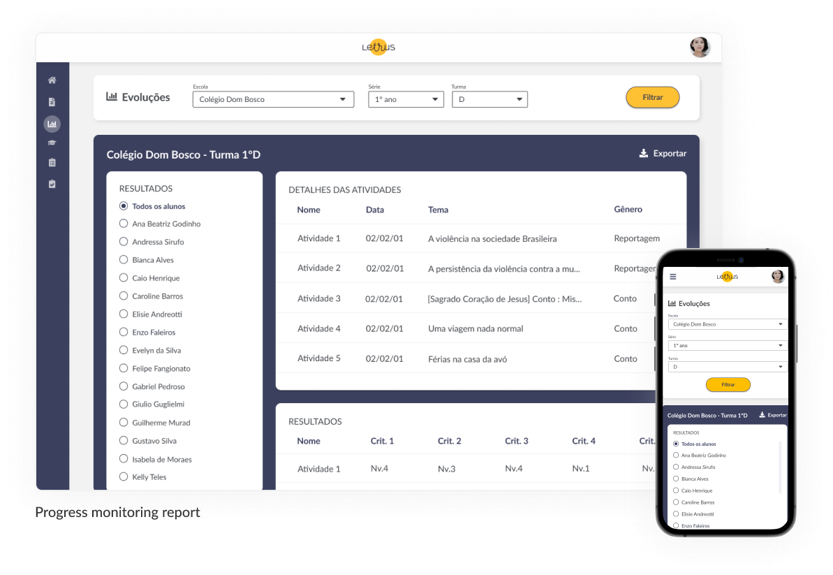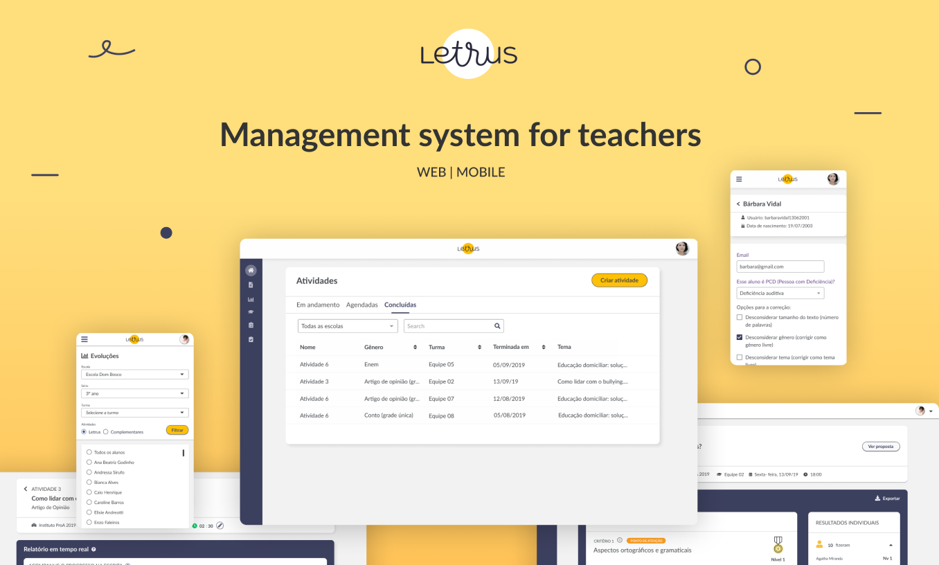 Letrus was born in 2015, founded by Portuguese teachers who dreamed of making Brazil a more literate country. I had the pleasure of being one of the company's first designers and collaborating with the construction of some of its products. Letrus uses artificial intelligence to analyze students' texts and help them to increase their performance and level of expression in writing. Firstly launched a product for High School, Students and Teachers. Focused on preparing students for Enem’s exam’s to enter at Universities in Brazil. This product, which I’ve also had the pleasure to work won an international prize and made us very glad.