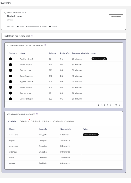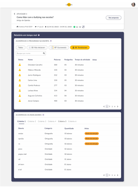 This screens are a demonstration of how teachers interface should look at the end of implementation process. It mostly shows reports of students works. The teachers also could have access to reports real-time, during students writing. It’s a new and innovative way of thinking and conducting a class and something that was never designed before in this context.
